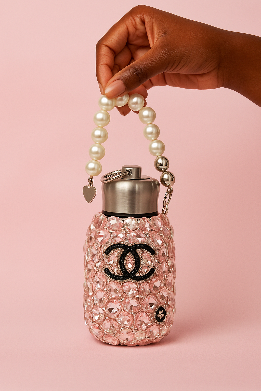 Élève ta routine avec cette gourde isotherme ultra-glamour, décorée de strass brillants et d’une poignée perles digne d’un bijou.